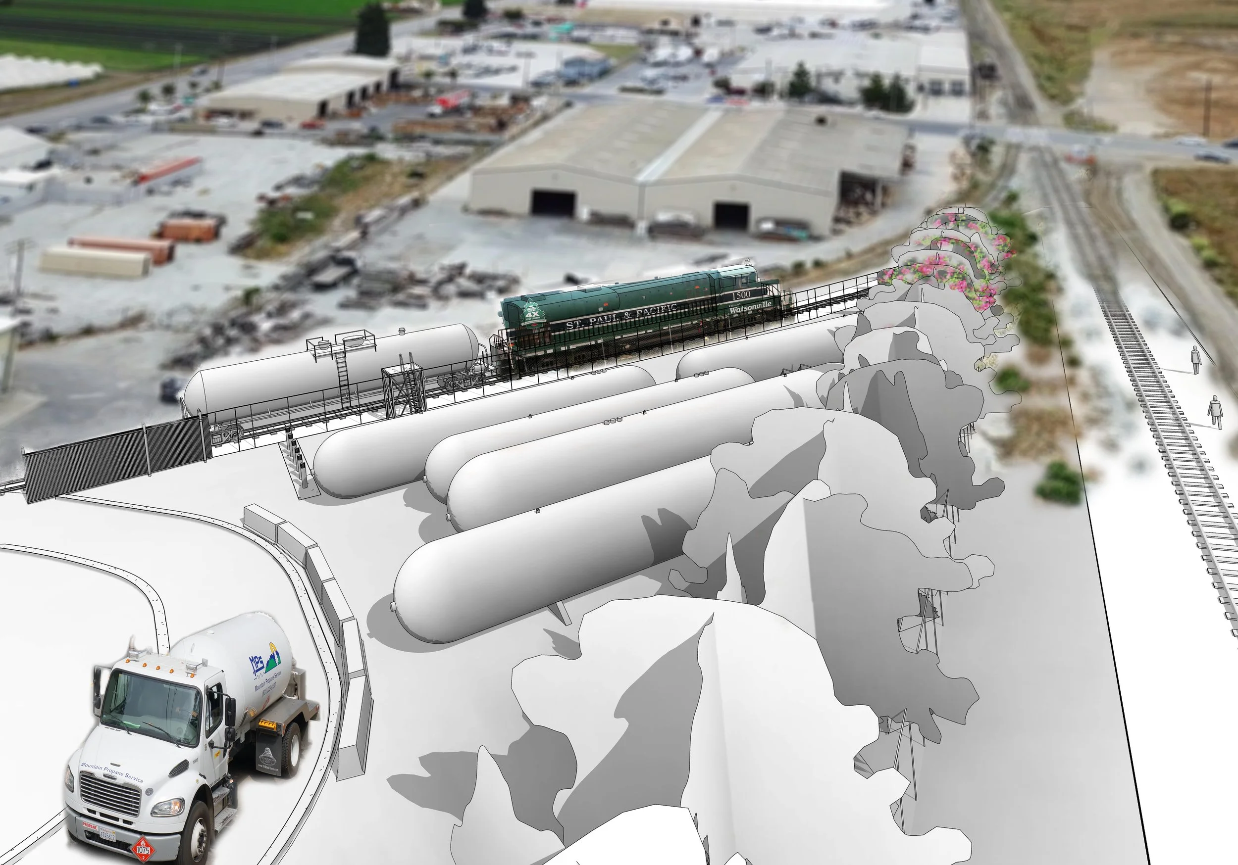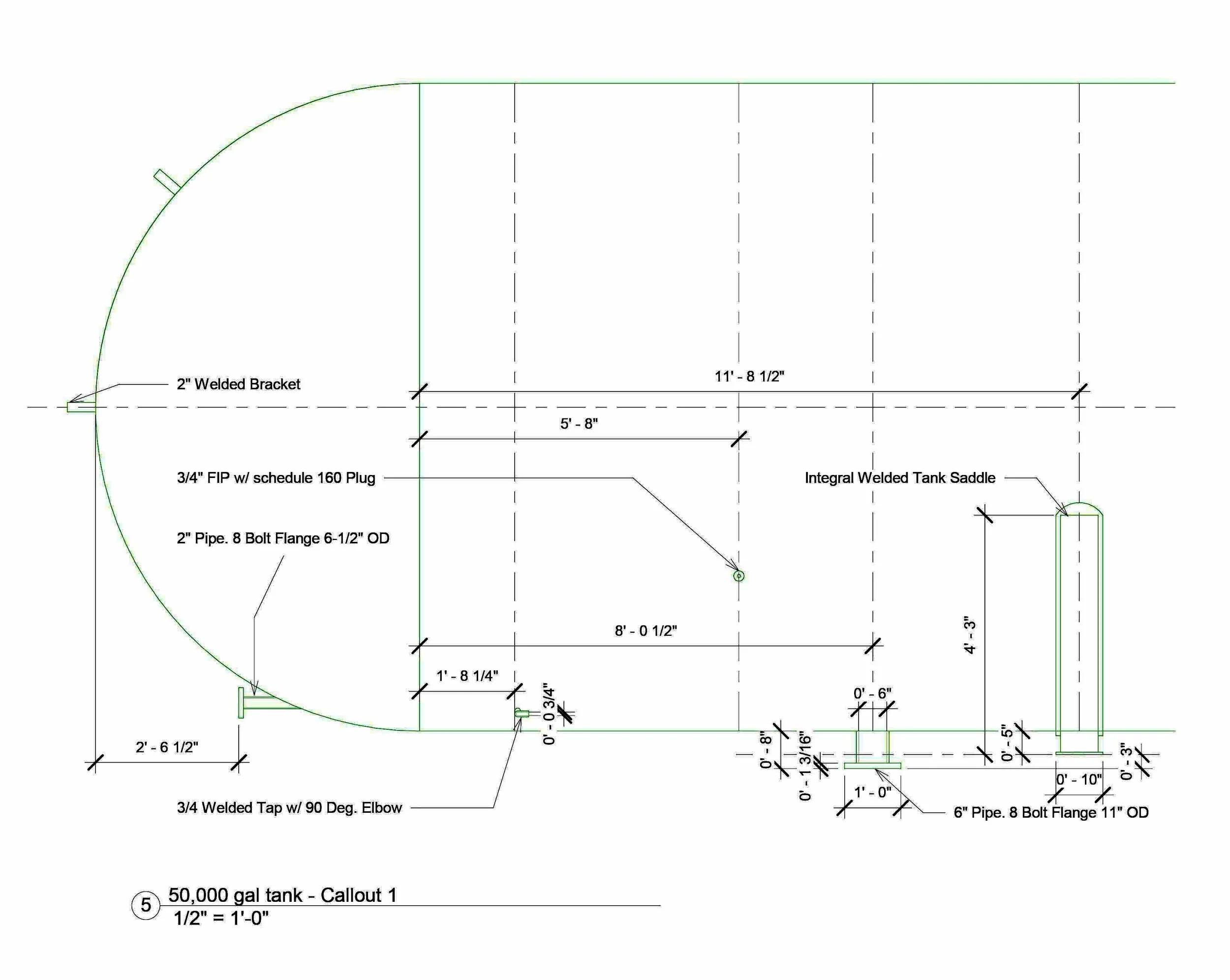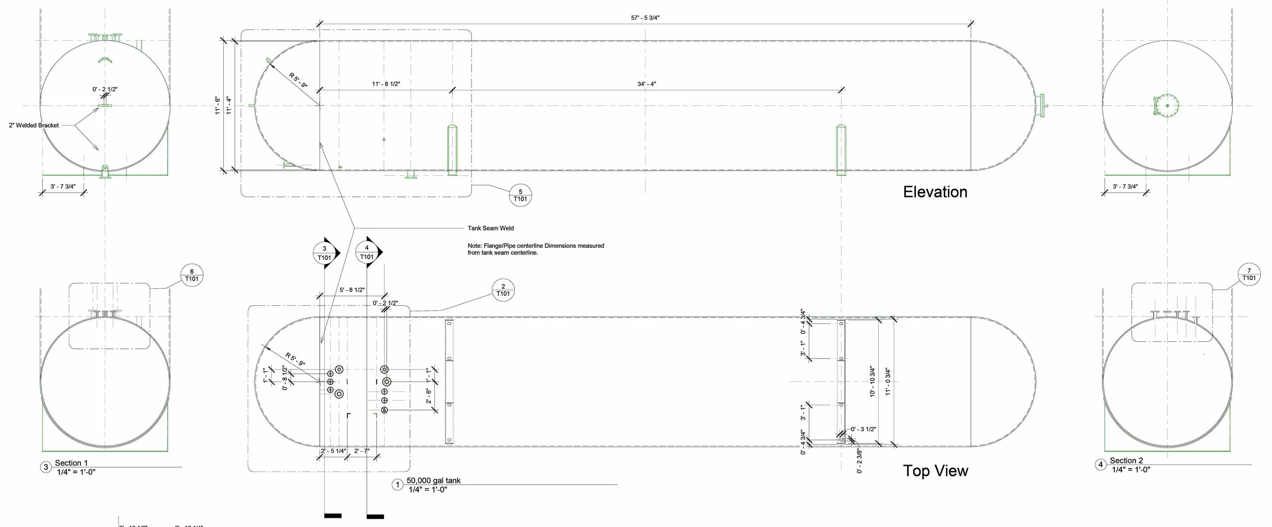 Plan, Elevations, and Sections of large 50,000 gallon propane tank